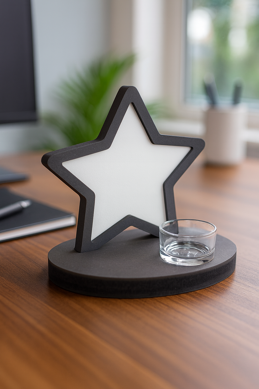Breng sfeer en persoonlijkheid in huis met deze theelichthouder in stervorm, speciaal ontworpen voor sublimatie. De MDF-inleg met witte toplaag en subtiele sinaasappelstructuur biedt de perfecte basis om te personaliseren met een foto, naam, tekst of uniek ontwerp.