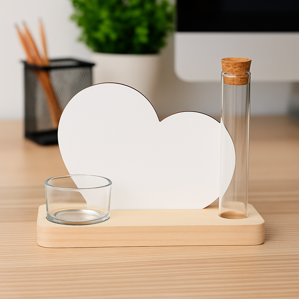 Dit sfeervolle plankje combineert eenvoud en creativiteit in één stijlvol design. Het wordt compleet geleverd met een glazen bloemenbuisje (zonder bloemen) en een theelichthouder. Het MDF-hart met witte toplaag is perfect geschikt voor sublimatie, zodat je het geheel eenvoudig kunt personaliseren met een eigen ontwerp, tekst of afbeelding.