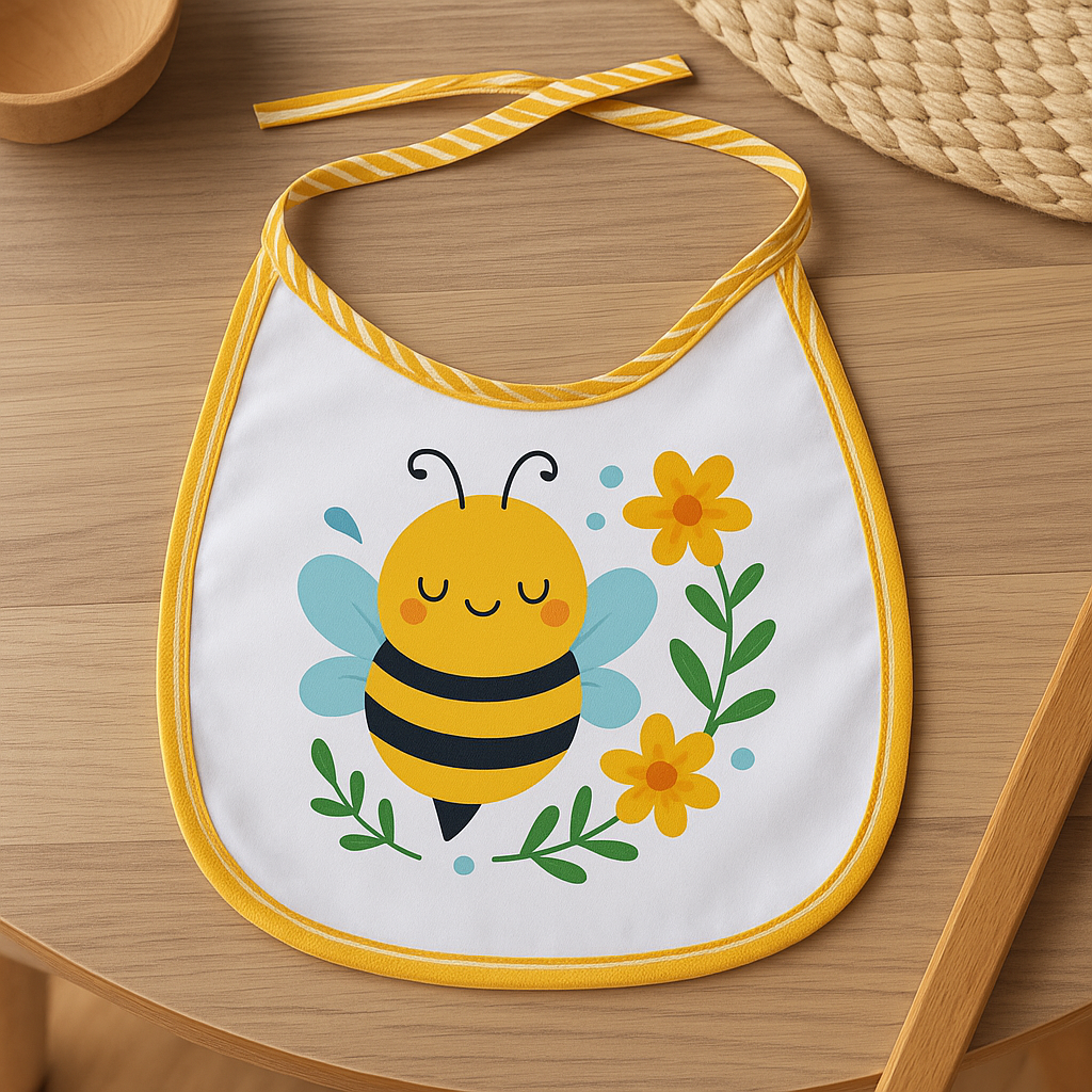 Wit slabbetje afgewerkt met geel gestreepte bies.