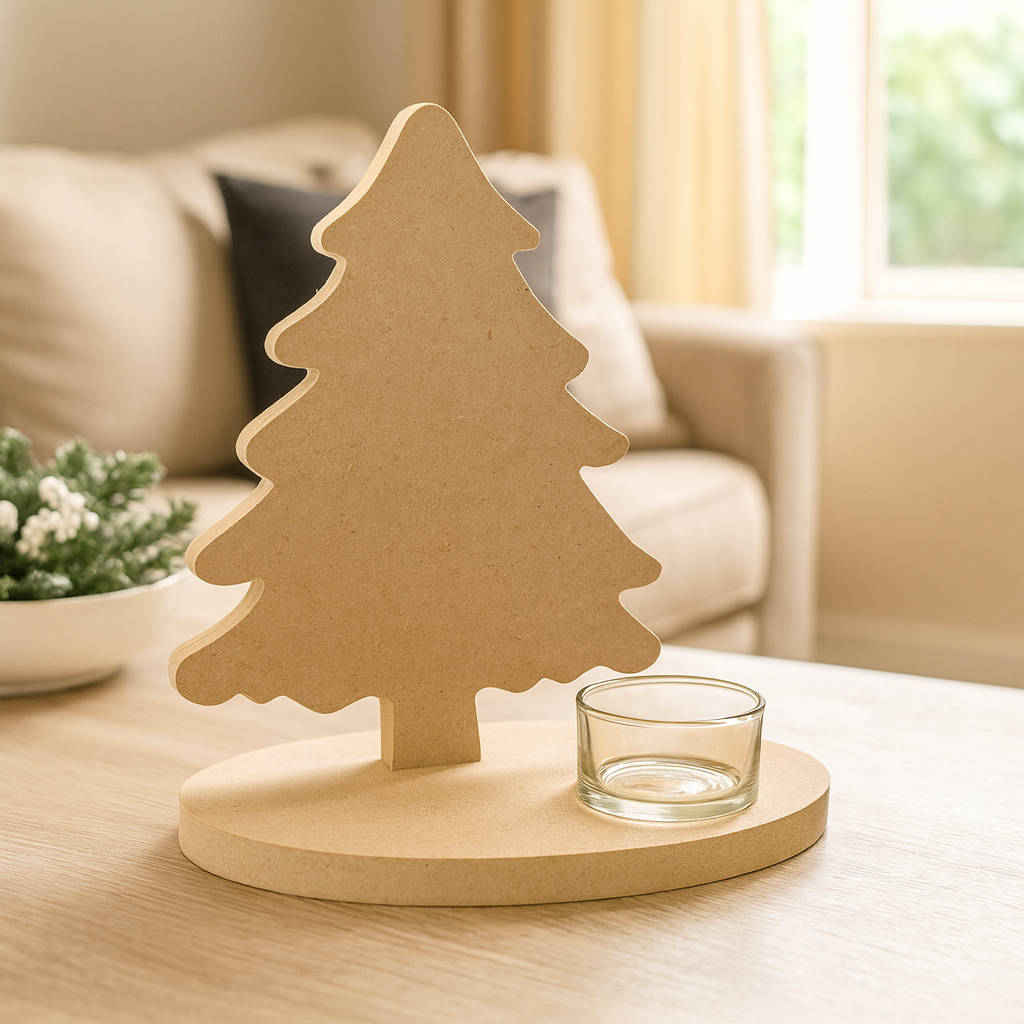 Breng warmte en gezelligheid in huis met deze sfeervolle theelichthouder in de vorm van een kerstboom, gemaakt van 12 mm MDF. De natuurlijke houtkleur zorgt voor een rustieke uitstraling die prachtig past bij de kerstsfeer, maar ook het hele jaar door een stijlvolle toevoeging is aan je interieur.