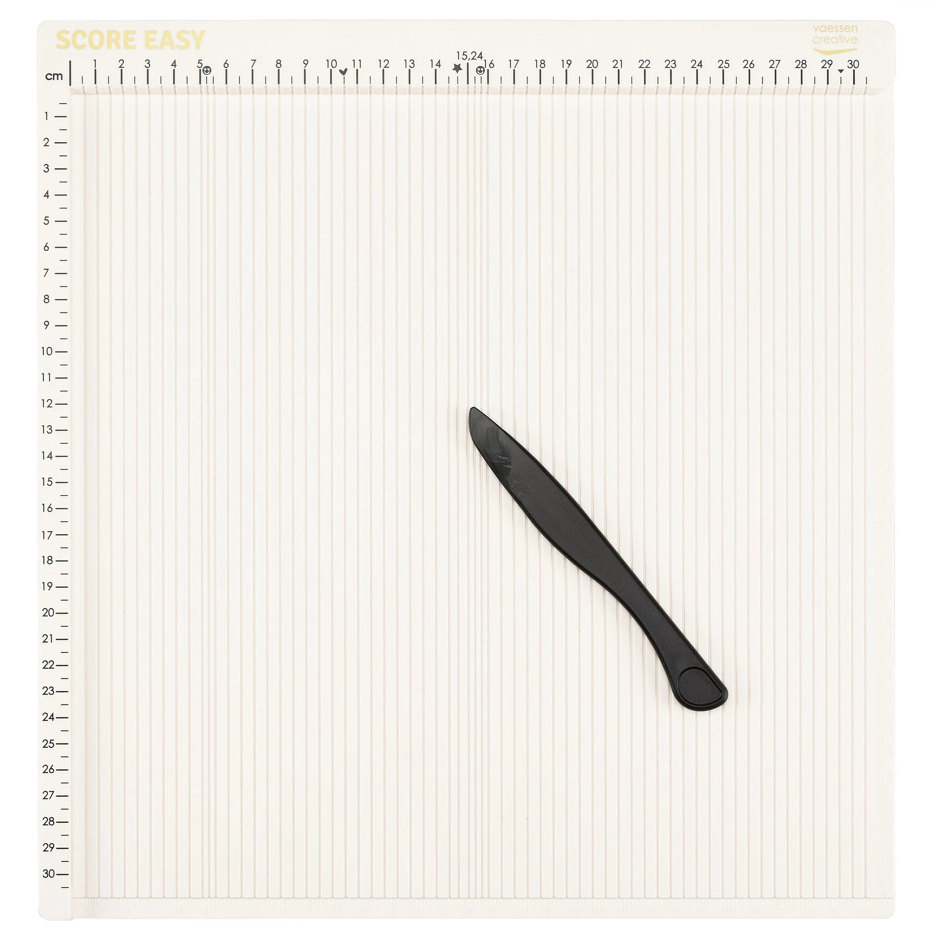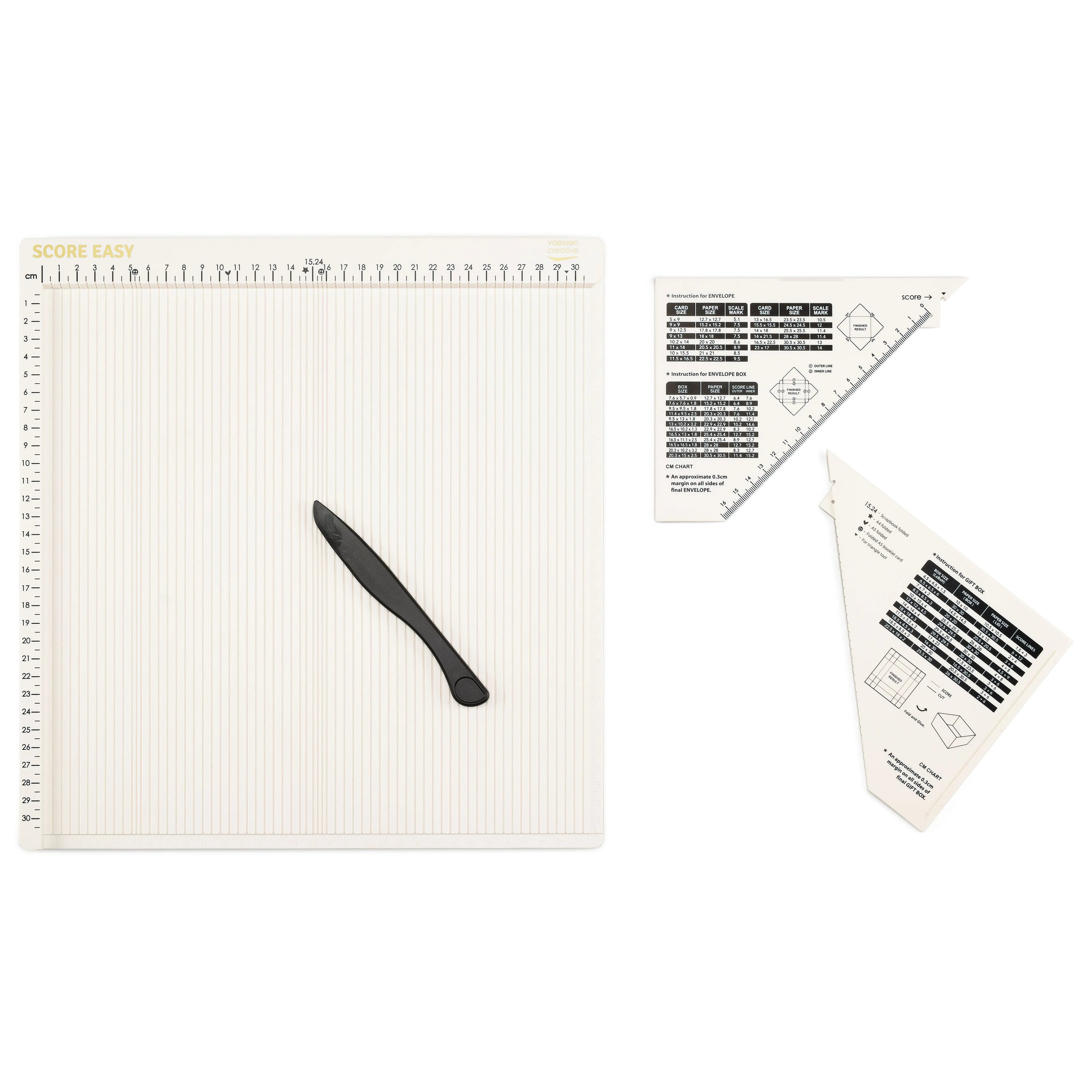 Maak je eigen kaarten, enveloppen en cadeaudoosjes met het Score Easy rilbord van Vaessen Creative. Dit onmisbare hulpmiddel is ideaal voor iedereen die graag met papier werkt. Met het rilbord trek je moeiteloos strakke vouwlijnen en ril je papier zonder scheuren. Dankzij de handige liniaal met duidelijke markeringen en pictogrammen (ster, hart en smiley) creëer je in een handomdraai kaarten, enveloppen en geschenkdozen. De pictogrammen geven extra rillijnen aan, zoals een perfecte middellijn voor scrapbookpapier, een vouwlijn voor A4- en A5-papier en een rillijn voor een A5 gatefold-kaart. De betekenis van de pictogrammen staat uitgelegd op de bijgeleverde driehoekige liniaal.