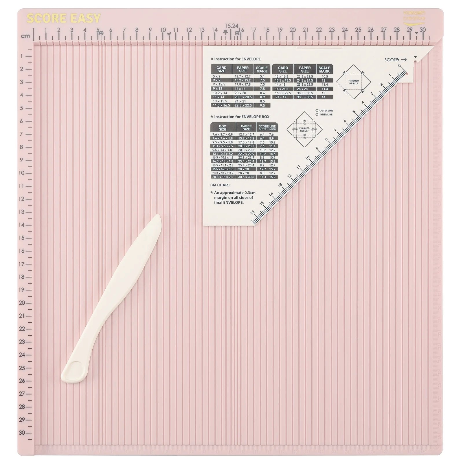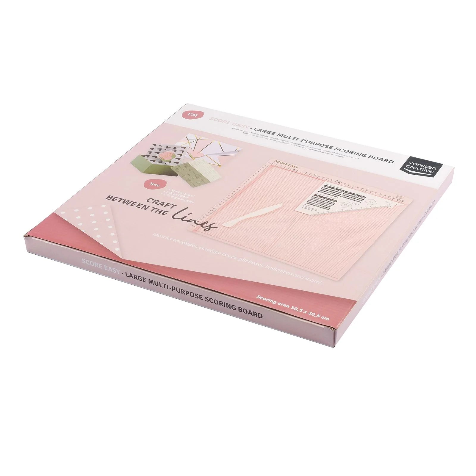 Maak je eigen kaarten, enveloppen en cadeaudoosjes met het Score Easy rilbord van Vaessen Creative. Dit onmisbare hulpmiddel is ideaal voor iedereen die graag met papier werkt. Met het rilbord trek je moeiteloos strakke vouwlijnen en ril je papier zonder scheuren. Dankzij de handige liniaal met duidelijke markeringen en pictogrammen (ster, hart en smiley) creëer je in een handomdraai kaarten, enveloppen en geschenkdozen. De pictogrammen geven extra rillijnen aan, zoals een perfecte middellijn voor scrapbookpapier, een vouwlijn voor A4- en A5-papier en een rillijn voor een A5 gatefold-kaart. De betekenis van de pictogrammen staat uitgelegd op de bijgeleverde driehoekige liniaal.
